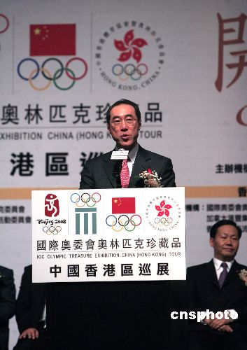 香港特區(qū)政務(wù)司司長唐英年為奧林匹克珍藏品中國香港區(qū)巡展致詞。