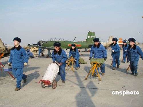 2008新年伊始,擔(dān)負(fù)新大綱飛行訓(xùn)練任務(wù)的濟(jì)空某飛行學(xué)院某團(tuán)訓(xùn)練場(chǎng)上呈現(xiàn)一派熱火朝天的練兵景象。該團(tuán)針對(duì)新期班訓(xùn)練任務(wù)新特點(diǎn),不斷加速推進(jìn)教育訓(xùn)練創(chuàng)新發(fā)展,科學(xué)籌劃,全面深化訓(xùn)練教學(xué)改革,積極探索訓(xùn)練新方法,實(shí)施科技興訓(xùn),嚴(yán)格按綱施訓(xùn),大力加強(qiáng)飛行學(xué)員基礎(chǔ)訓(xùn)練,著力提高訓(xùn)練水平和效益,確保了節(jié)后飛行軍事訓(xùn)練緊張有序展開。中新社發(fā) 耿國慶 攝