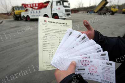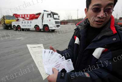 楊先生回憶說,昨天凌晨2時,他的貨車突然壞在北苑路上,被巡邏的交通隊發(fā)現(xiàn),并撥打了新通拖車公司電話。新通公司來后把掛鉤掛在楊先生的車上,并告訴他:“拖車出場費是6000元,掛上你的車就要5000元,另外每公里收費一百元!薄皼]想到車還沒拖就得交11000元,我當時就不想拖了,可對方告訴我,拖車是他們的責任,而且鉤子已經(jīng)掛上了我的車,就算不拖了還是要交錢!睏钕壬鷼鈶嵉卣f。昨天早上6點左右,新通公司將楊先生的車拖到了位于豐臺的公司,除了出場費、掛車費和36公里的里程費總共算下來一共要14600元。