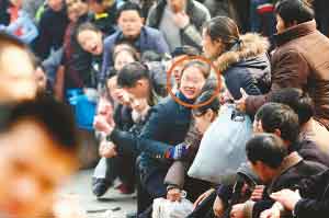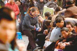 回到隊(duì)伍末端,瘦小男子只得重新排隊(duì)。他一臉無辜的自稱涪陵區(qū)人,名叫孫文件,在天津打工,從13日便開始候票。孫先生告訴記者,排在隊(duì)伍前面的一半左右的人都是票販子。他說,之所以這么肯定這些插隊(duì)的人是票販子,是因?yàn)樗J(rèn)得其中一個(gè),那個(gè)人13日下午向他兜售過到北京的硬坐車票,加價(jià)250元,他沒敢要。