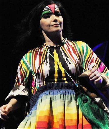 我一直懷疑她是中國的孩子,只是長(zhǎng)得不好看,被上帝貶謫到冰島而已。但她的確和中國有著許多不解之緣。唐裝、京劇、琵琶、二胡都是她的最愛,就連和服、高麗的發(fā)型也都是中國制作,難怪她在演出時(shí)連“謝謝”都說得那么地道。