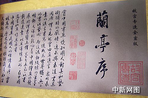 2006年11月15日,由中國故宮博物院監(jiān)制的全幅長七米,寬三十五厘米的黃金珍藏版《蘭亭序》長卷在書圣王羲之曲水流觴之地-紹興蘭亭所在地正式發(fā)行。據(jù)悉,此黃金珍藏版《蘭亭序》長卷在浙江尚屬首發(fā)。