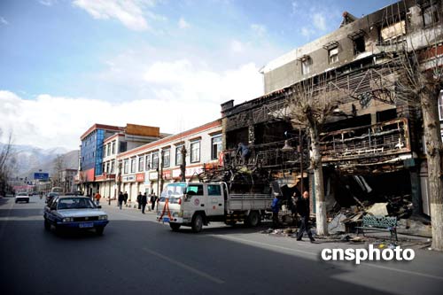 3月19日,工作人員正在清理拉薩市朵森格路被焚毀的店鋪。