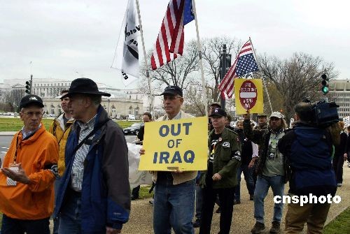3月19日,在伊拉克戰(zhàn)爭(zhēng)爆發(fā)五周年的日子里,美國(guó)華盛頓國(guó)會(huì)山前聚集了大批反戰(zhàn)示威人群。一些示威者呼喊反戰(zhàn)口號(hào),呼吁美軍“撤出伊拉克”。中新社發(fā) 邱江波 攝