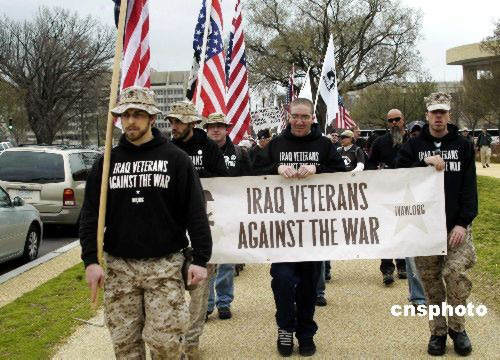 圖為反戰(zhàn)示威者中曾經(jīng)在伊拉克戰(zhàn)場(chǎng)執(zhí)行任務(wù)的退伍老兵舉著抗議牌表達(dá)反戰(zhàn)的呼聲。