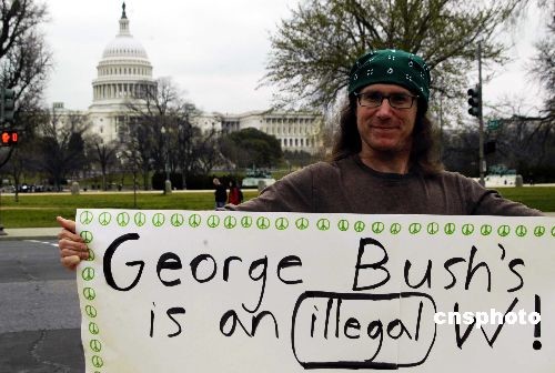 圖為一位示威者舉著的牌子上寫(xiě)著“布什政府在伊拉克的戰(zhàn)爭(zhēng)是非法的,不道德的”。