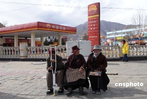 3月20日,三名藏族大嬸坐在拉薩市街頭長(zhǎng)椅上曬太陽,享受明媚春光。