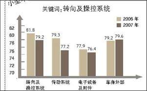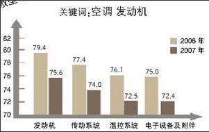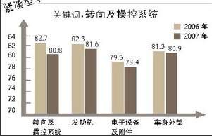 在對(duì)去年初始質(zhì)量滿意度的測(cè)評(píng)指標(biāo)中,緊湊型轎車“發(fā)動(dòng)機(jī)”環(huán)節(jié)滿意度得分最高,“電子設(shè)備及附件”環(huán)節(jié)滿意度得分最低。初始質(zhì)量各環(huán)節(jié)滿意度均低于2006年得分,“轉(zhuǎn)向及操控系統(tǒng)”滿意度降幅最大。