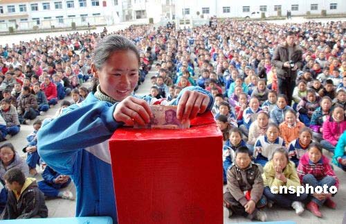 拉薩市堆龍德慶縣中學(xué)的1825名師生3月23日向“3·14”事件受害民眾捐款,同學(xué)們拿出平時(shí)節(jié)省的零花錢踴躍獻(xiàn)愛心。3月14日拉薩市發(fā)生打、砸、搶、燒事件后,拉薩市各企事業(yè)單位、民間組織等社會(huì)各界紛紛譴責(zé)達(dá)賴集團(tuán)的罪惡行徑,紛紛捐款捐物關(guān)懷受害無(wú)辜民眾。中新社發(fā) 周波 攝