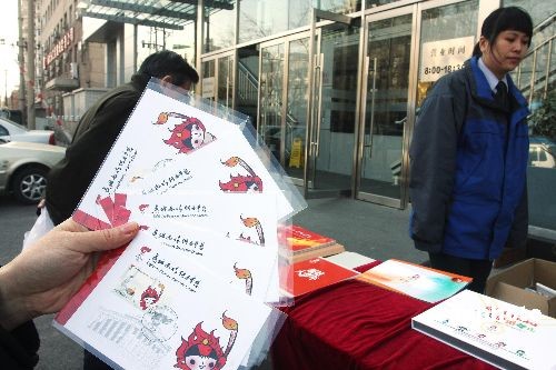 3月24日,北京百萬莊郵局工作人員正在發(fā)售《第29屆奧林匹克運動會--火炬接力》紀念郵品。當(dāng)日,2008年首套奧運郵票《第29屆奧林匹克運動會--火炬接力》正式發(fā)行。中新社發(fā) 追影 攝