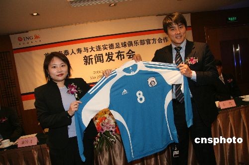 3月25日,在中超2008賽季開賽的前4天,大連實(shí)德足球俱樂部舉行新聞發(fā)布會(huì)?偨(jīng)理李明及主教練拉德科出席并正式宣告首創(chuàng)安泰人壽成為其官方合作伙伴。發(fā)布會(huì)上還展示了大連實(shí)德的中超2008賽季新隊(duì)衣。中新社發(fā) 大新 攝