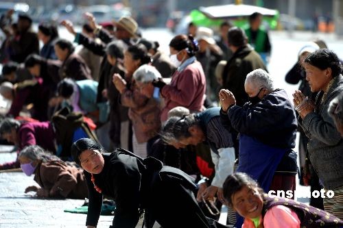 眾多信眾在布達拉宮廣場上叩首。中新社發(fā) 廖攀 攝