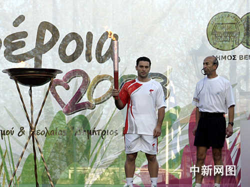 3月26日,北京奧運會圣火希臘境內傳遞第三日,抵達當天最后一個城市韋里亞。最后一位火炬手希臘手球運動員吉米多斯點燃了圣火盆。中新社記者 王歡