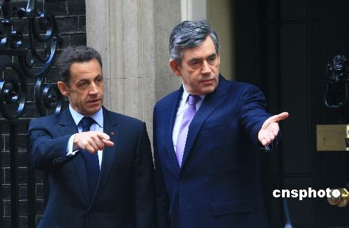 圖為布朗(右)和薩科奇會見后準(zhǔn)備離開,前往出席英法高峰會。中新社發(fā) 李鵬 攝