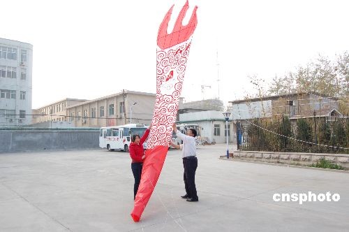 喜迎奧運(yùn)圣火 “祥云火炬”風(fēng)箏濰坊試飛(3)