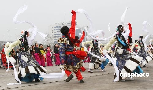 2008年3月29日,在北京雕塑公園西側(cè)廣場,由北京市文化局組織的廣場文藝演出正在緊張排練中。由兒童、中學生、大學生、年輕人到六七十歲的老人們組成的幾個演出板塊,都是為了3月31日參加天安門廣場的迎接奧運圣火演出。為了迎接那最圣神的一天到來,演員們正緊張有序地排練著。