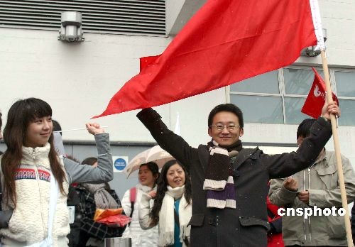 圖為中國(guó)留學(xué)生在溫布利體育場(chǎng)外為奧運(yùn)圣火助威。 沈晨 攝