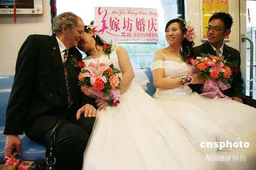 4月19日,新人們準(zhǔn)備乘坐南京地鐵“婚車專列”。當(dāng)日,南京舉辦“幸福長(zhǎng)城2008”地鐵集體婚禮,12對(duì)新人在行進(jìn)中的南京地鐵“婚車專列”上喜結(jié)良緣,讓其他乘客一道共同感受甜蜜喜慶的氣氛,分享他們的幸福時(shí)光。中新社發(fā) 鐘山 攝