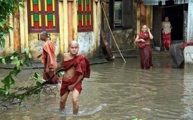在緬甸的最大城市仰光,和尚們涉水行進(jìn)。