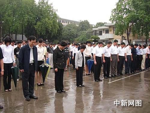 五月十九日十四時(shí)二十八分,近千名福建漳州市黨政機(jī)關(guān)干部冒著綿綿細(xì)雨,在政府大院的國(guó)旗下默哀,深切哀悼四川汶川大地震遇難同胞。正在當(dāng)?shù)乜疾斓娜珖?guó)人大常委會(huì)副委員長(zhǎng)陳至立(前排左二),和福建省政府、人大官員一起參加默哀。呂峰鵬 攝