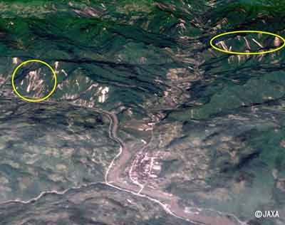 北京時間5月12日14:28,四川汶川發(fā)生里氏8級地震,日本宇宙航空研究開發(fā)機(jī)構(gòu)(JAXA)19日在其網(wǎng)站上刊登了利用陸地觀測技術(shù)衛(wèi)星(ALOS)觀測的數(shù)據(jù)圖。此次觀測的重點(diǎn)區(qū)域是北川縣,數(shù)據(jù)取得時間是北京時間5月18日11:49,通過圖樣對比,可以看出此次地震對北川縣的破壞情況。