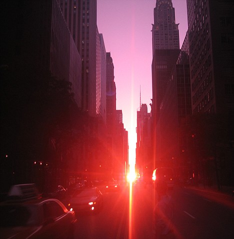 據(jù)悉,每年有兩天落日會(huì)對(duì)齊紐約曼哈頓主要的東西向街道,城市中高建筑會(huì)擋住落日,使曼哈頓看起來像是現(xiàn)代的巨石陣,整個(gè)紐約不夜城都沐浴在陽光下。
