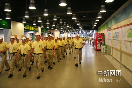 安保人員列隊(duì)進(jìn)入主新聞中心進(jìn)行排爆工作。攝影:宋方燦