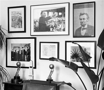 辦公室里有一面“英雄墻”,貼的都是他欽佩的歷史人物照片,其中有亞伯拉罕·林肯、甘地和他的紡車、馬丁·路德·金和約翰·F·肯尼迪。墻上還掛了一份加了外框的1963年華盛頓游行時(shí)日程安排的原始文件,金正是在那次游行過(guò)程中發(fā)表了《我有一個(gè)夢(mèng)想》的演講。