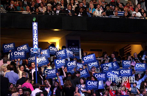 Jim Leach作為共和黨員也上臺(tái)為奧巴馬發(fā)表演講,臺(tái)下觀眾紛紛拿出“同一個(gè)國家”的標(biāo)語表示支持。馬婧 攝