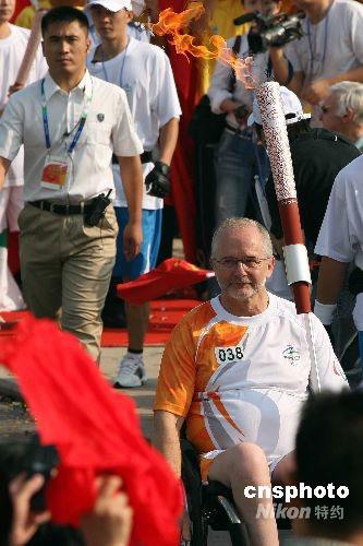 火炬手、國(guó)際殘奧委會(huì)(IPC)主席菲利普·克雷文(Philip Craven)傳遞火炬。中新社發(fā) 張宇 攝