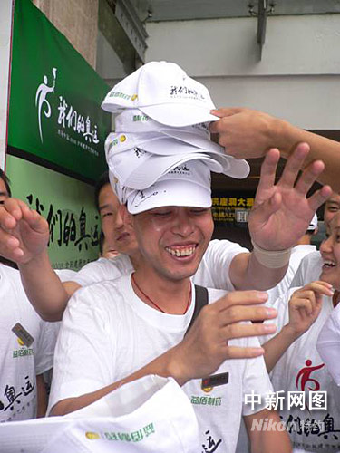 當(dāng)更多的人聽說這個(gè)消息后,爭相聚攏過來,把頭上的帽子一層層戴在徐先生的頭上,上面戴不住了,又往徐先生的懷里送。外層的志愿者們眼看擠不上去,就干脆把帽子扔向徐先生。懷里抱著一堆帽子,頭上頂著幾層帽子,徐先生樂開了花。