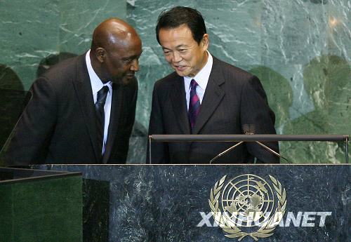 9月25日,在美國紐約聯(lián)合國總部,參加聯(lián)大一般性辯論的日本首相麻生太郎(右)用日語講了幾分鐘后被告知大會(huì)的日語翻譯還沒就位。直到日語翻譯就位后,麻生太郎才繼續(xù)演講。當(dāng)日,第63屆聯(lián)大一般性辯論進(jìn)入第三天。新華社記者 侯俊 攝