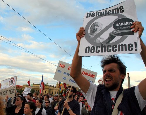 資料圖片:數(shù)千捷克民眾今年8月8日在布拉格舉行示威游行,抗議政府簽約同意美國在捷克建立反導(dǎo)雷達(dá)基地。這位示威者舉著的標(biāo)語寫道:“謝謝,我們不要美國雷達(dá)!” (攝影:黃頻/中歐社)