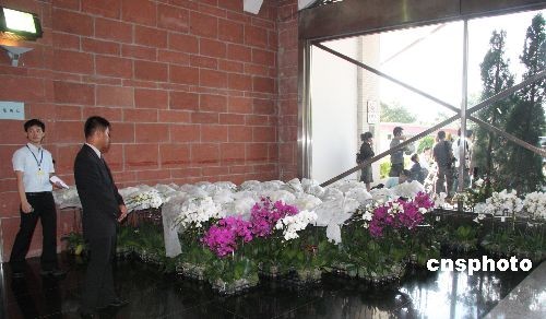 臺(tái)塑企業(yè)創(chuàng)辦人王永慶的遺體十七日由長(zhǎng)榮班機(jī)運(yùn)抵臺(tái)灣,靈堂設(shè)在桃園縣的長(zhǎng)庚大學(xué)活動(dòng)中心。圖為大批潔白的蝴蝶蘭鮮花運(yùn)抵靈堂。從十八日上午開始,靈堂開放各界吊唁。中新社發(fā) 耿軍 攝