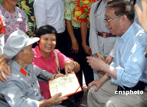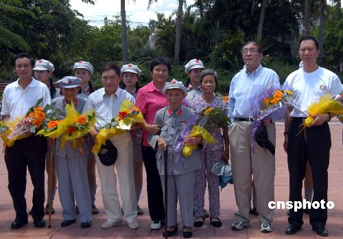 2007年6月26日,著名導演謝晉和演員牛犇代表劇組向紅色娘子軍老戰(zhàn)士王運梅、陳振梅贈送慰問金、獎?wù)潞妥C書。為慶祝中國人民解放軍建軍80周年,中央電視臺15集大型系列片《祖國不會忘記》劇組專程來到紅色娘子軍的故鄉(xiāng)海南瓊海市攝制有關(guān)專題。當天中午,曾執(zhí)導故事片《紅色娘子軍》的著名導演謝晉和該片演員牛犇隨劇組來到紅色娘子軍紀念園再會娘子軍老戰(zhàn)士。中新社發(fā) 蒙鐘德 攝