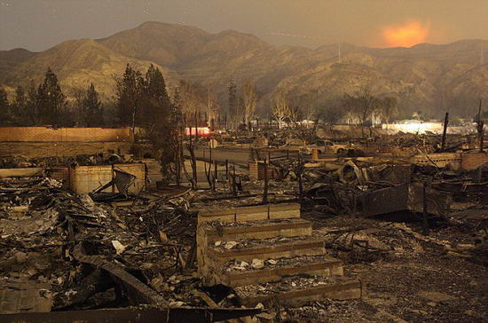 大火是上周四晚上在人口密集的圣費爾南多山谷燃起的,摧毀了數(shù)十間房屋,并對關(guān)鍵的電力供應線路構(gòu)成了威脅。大火在風力的幫助下燒過干燥的山谷和山坡,熱風使當?shù)販囟冗_到創(chuàng)記錄的30度;饎菰跁r速達112公里的強風的幫助下蔓延了2600英畝,迫使1萬名居民撤離,自上周四以來,過火面積已超過20000英畝,發(fā)生火情的地區(qū)包括洛杉磯北部的山丘、東南部的奧蘭治縣山谷、北部圣巴巴拉縣附近名人聚集的蒙特其托居住區(qū)。估計有1000套房屋被燒毀。加州州長施瓦辛格在視察火災造成的損失情況后稱:“對于南加州人來說,過去的幾天非常艱難!