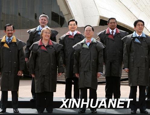 2007年9月8日,亞太經(jīng)濟(jì)合作組織第十五次領(lǐng)導(dǎo)人非正式會(huì)議第一階段會(huì)議開(kāi)始前,各成員領(lǐng)導(dǎo)人身著澳大利亞特色服裝在悉尼歌劇院合影。新華社記者黃敬文攝