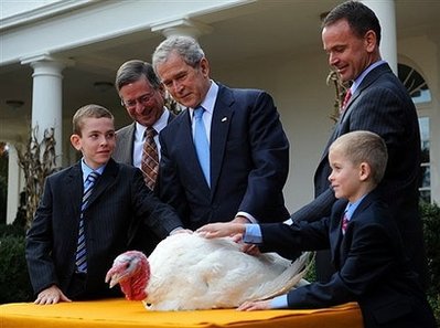 中新網(wǎng)11月27日 綜合報(bào)道,當(dāng)?shù)貢r(shí)間26日,感恩節(jié)前日,小布什最后一次作為美國總統(tǒng),在白宮出席了一年一度的火雞放生儀式。在這個(gè)充滿溫暖氣氛的節(jié)日到來之際,布什的一言一行都顯得溫和、充滿感恩意味。