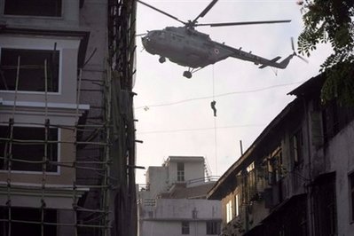 印度特種兵沖入孟買一家猶太人中心,試圖救出在建筑內(nèi)被激進分子劫持的多名人質(zhì)。電視新聞畫面顯示,特種兵從猶太人上空的直升機由繩索滑下,而在地面其他軍人也沖入中心所在的建筑物。與此同時,保安部隊也仍在泰姬陵酒店和奧布羅伊酒店內(nèi)搜剿槍手。