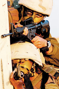 M-4A1卡賓槍——以色列士兵貼身武器,有效射程不超過300米。對比AK-47來說,M-4A1卡賓槍在精度上有優(yōu)勢,但在射程及殺傷性上稍微遜色。(木生 李亮亮 沈基飛)