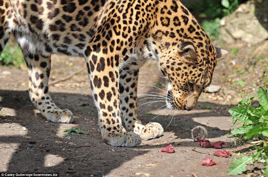 英國(guó)媒體5日刊出了一組照片,照片中的小老鼠看來(lái)只有兩三個(gè)月大,在動(dòng)物園的喂食時(shí)間稍過(guò)不久,便見(jiàn)它蹦蹦跳跳的溜進(jìn)了豹子的地盤(pán)。來(lái)干嘛?呵呵,偷點(diǎn)小點(diǎn)心嘗嘗唄!