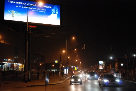 圖為捷克首都布拉格北面通向德國(guó)方向的交通要道一個(gè)路口上矗立的巨大廣告牌。設(shè)計(jì)者把捷文“穿行歐洲之路暢通無(wú)阻” 三個(gè)單詞中的字母“O” 巧妙地變成交通信號(hào)燈,而且三盞燈全是綠燈,喜悅之情躍然牌上。(黃頻)