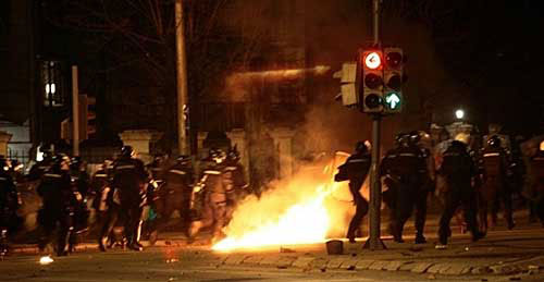 據(jù)聯(lián)合早報(bào)網(wǎng)報(bào)道,大約一千名憤怒的塞族青年,到美國(guó)大使館、一間美式快餐店和歐盟輪任主席國(guó)斯洛文尼亞大使館投擲石塊,并與防暴警察沖突,示威者又拆去歐盟旗幟,示威者又縱火、燒車,打爛大使館的玻璃窗。防暴警察以催激氣體及橡膠子彈驅(qū)散,又施放催淚氣體和出動(dòng)警棍驅(qū)散。