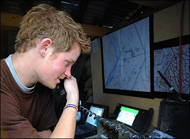 23歲的哈里王子在駐阿英軍第52旅下屬的皇室騎兵團(tuán)作戰(zhàn)組服役,他在赫爾曼德省邊遠(yuǎn)地區(qū)的任務(wù)是協(xié)調(diào)各種飛機(jī)的作戰(zhàn)行動(dòng),其中包括美國(guó)的F-15戰(zhàn)斗機(jī)、英國(guó)的“鷂”式攻擊機(jī)、阿帕奇武裝直升機(jī)、 C-130H“大力士”運(yùn)輸機(jī)。他因此要和英國(guó)皇家空軍“鷂”式攻擊機(jī)女飛行員米歇爾-湯普金斯和她的同事們保持經(jīng)常性的接觸,飛行員只有在獲得他的批準(zhǔn)后才能對(duì)目標(biāo)發(fā)動(dòng)攻擊。