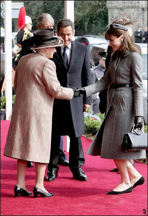 薩科齊夫婦隨后來到溫莎堡,英國女王在那里迎接他們到訪?ɡ·布呂尼向女王行屈膝禮,之前布呂尼已經(jīng)為這次見面準(zhǔn)備了很長時間。薩科齊則在女王丈夫菲利浦親王的陪同下檢閱了英國皇家軍隊。