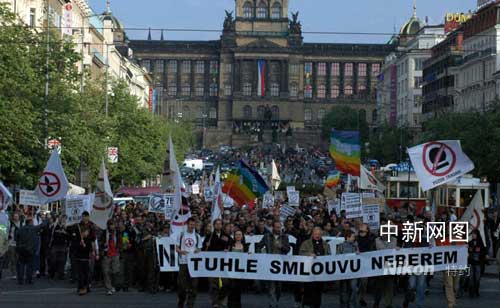 據(jù)聯(lián)合早報網(wǎng)報道,游行隊伍從布拉格瓦茨拉夫廣場出發(fā),朝總理府前進。游行者手舉“不要雷達基地”、“對雷達說不”等旗幟和標語牌,他們也高喊抨擊政府的口號。