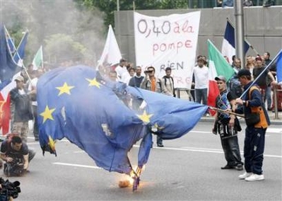 示威者縱火焚燒歐盟旗幟。