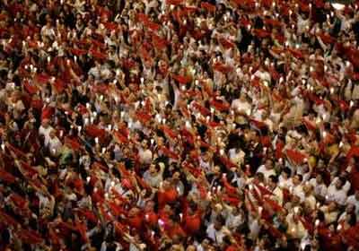 中新網(wǎng)7月15日電 綜合報道,7月15日凌晨,為期9天的盛大的奔牛節(jié)在西班牙北部城市潘普洛納落下帷幕。成千上萬的狂歡者聚集到市政廳前,手舉蠟燭和紅絲巾參加閉幕活動。