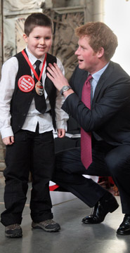 在頒獎典禮上,24歲的哈里蹲下身擁抱每一個獲獎兒童,給予他們充滿溫暖的問候和笑容。為了緩解孩子們的緊張,哈里一直用手輕拍他們的后背。他小心翼翼給一個小女孩戴上獎牌唯恐碰到女孩頭發(fā),讓人實在無法想象他曾是一個醉醺醺出盡洋相的“混世魔王”。這位“愛心王子”的用心,讓每一個緊張的孩子露出可愛的笑臉。