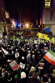 在倫敦,數(shù)千人手持巴勒斯坦旗幟,在首相府外抗議,部份示威者又向首相府扔鞋。